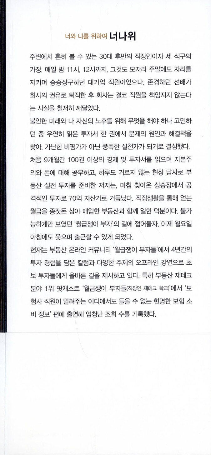 저자 너나위는 유명 경제 유튜브 <신사임당> 채널의 재테크 좀 ‘아는 선배’에 출연해 이 시대 ‘집 걱정’으로 밤잠을 이루지 못하는 이들의 고민에 진심 어린 조언과 따뜻한 위로를 건네며 수많은 팬에게 사랑받았다. 그는 투자 3년 만에 30년 치 연봉을 벌고 책을 출간한 지 2년 만에 100억 자산가로 거듭나, 진정한 ‘파이어족(Financial Independence Retire Early, FIRE)이’ 되었다.