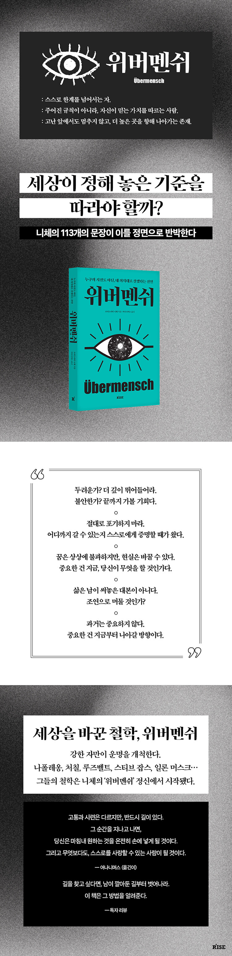 니체가 주장한 ‘초인(Übermensch)’의 철학을 현대적으로 풀어낸 책이다. 위버멘쉬란 기존의 도덕과 사회적 관습을 그대로 따르는 대신, 자신의 의지로 새로운 가치를 창조하며 스스로의 삶을 개척하는 존재를 의미한다. 그는 외부의 기준에 흔들리지 않고, 모든 고통과 시련을 넘어 더 높은 곳을 향해 나아간다.