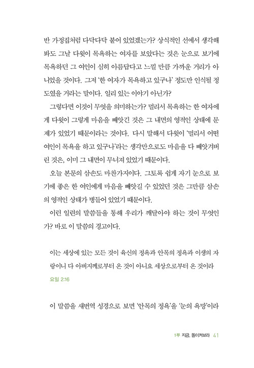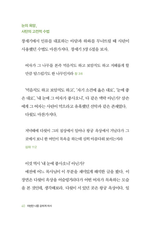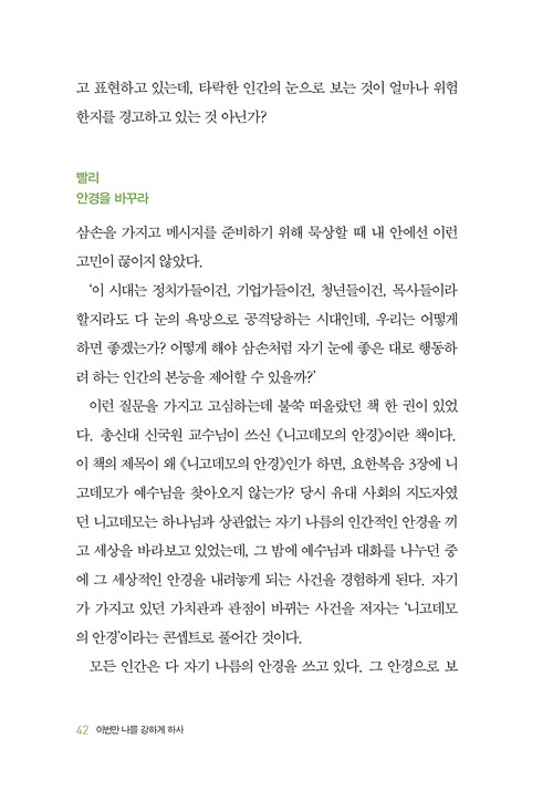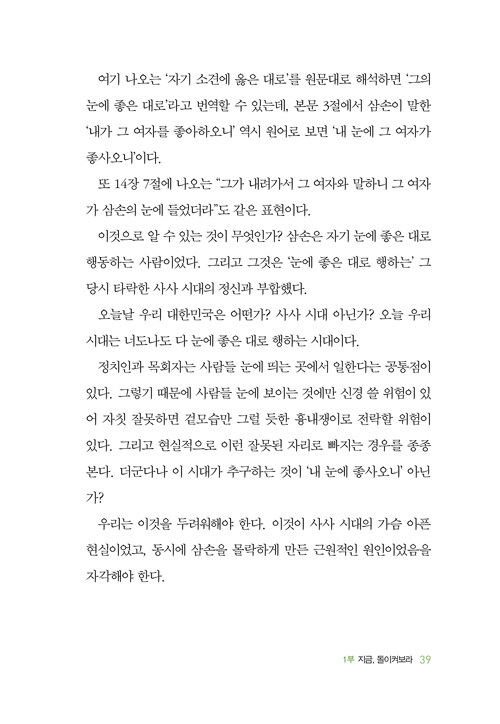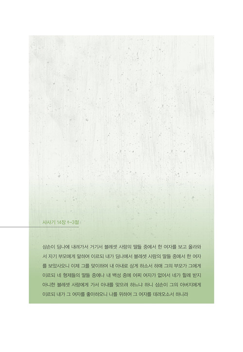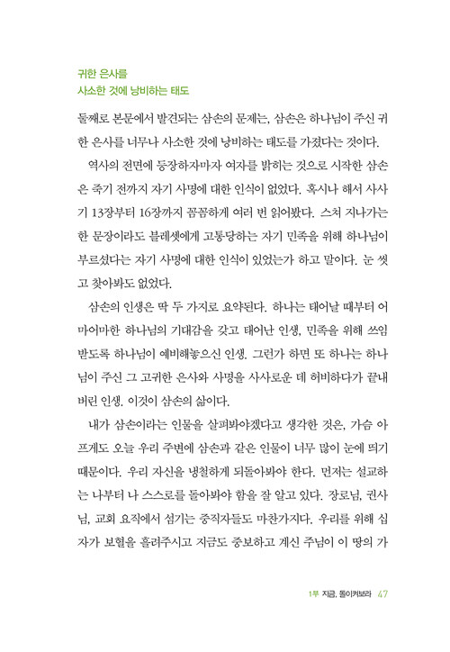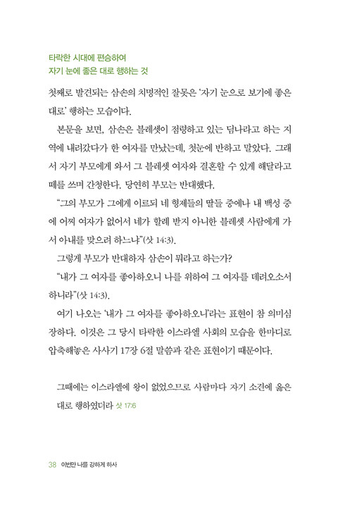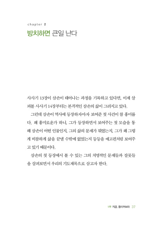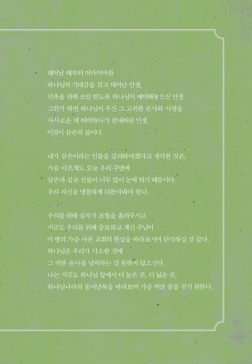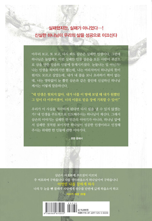 우리가 이 사실을 자각하게 된다면 다시 힘을 낼 수 있지 않겠는가? 내 인생을 주도적으로 인도해주시는 하나님이 계신다. 그래서 삼손의 이야기는 실패한 한 인간의 이야기가 아니라, 하나님 앞에서 실패한 것처럼 보이지만 하나님이 성공한 인생이라고 인정해주시는 위대한 한 인물에 관한 이야기다.