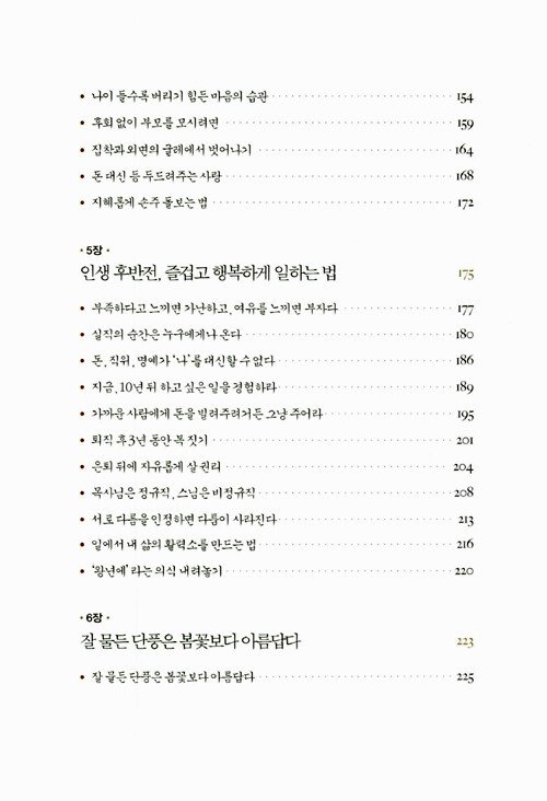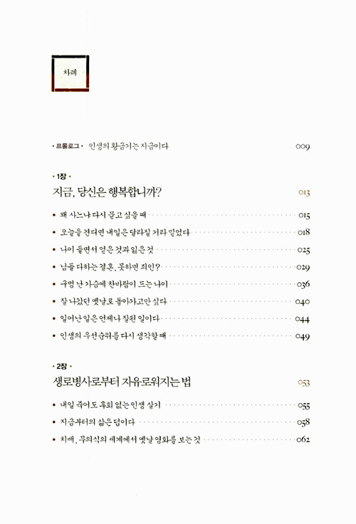 행복하게 나이 드는 법에 대한 법륜 스님의 혜안이 담긴 책. 스님은 힘겨운 시대, 팍팍한 현실을 헤쳐 나가야 하는 중년 이후 노년들에게 “인생의 황금기는 바로 지금”이라고 이야기한다. 흔히 나이가 들면 지난 이야기를 하면서 추억에 잠기고 지난 세월을 그리워하는데, 자기를 긍정하고 현재의 삶을 더 좋게 만들어나가라고 조언한다.