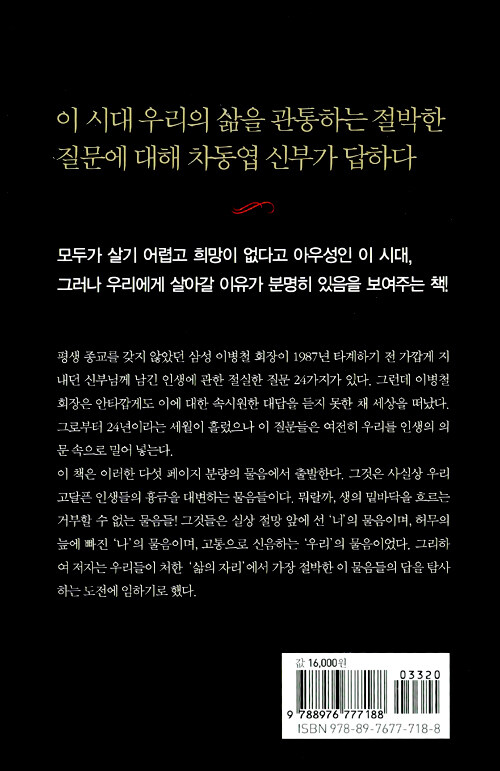 《무지개 원리》의 저자이자 연 600회 강연을 소화하며 대중과 소통해온 우리 시대 멘토 중 하나인 차동엽 신부의 신간. 저자는 이 시대 사람들이 마음속 깊은 곳에 묻어두고 있는 생각, 즉 ‘도대체 무엇을 위한 인생인가?’ 라는 의문을 마음 밖으로 끌어내기로 작정했다. 24년 전 삼성그룹의 창업자 이병철 회장이 남긴 삶과 죽음, 성(聖)과 속(俗)에 관한 질문지를 만난 것이 그 계기가 되었으나 목적은 하나였다. 모두에게 ‘희망’을 주고 싶다는 것.