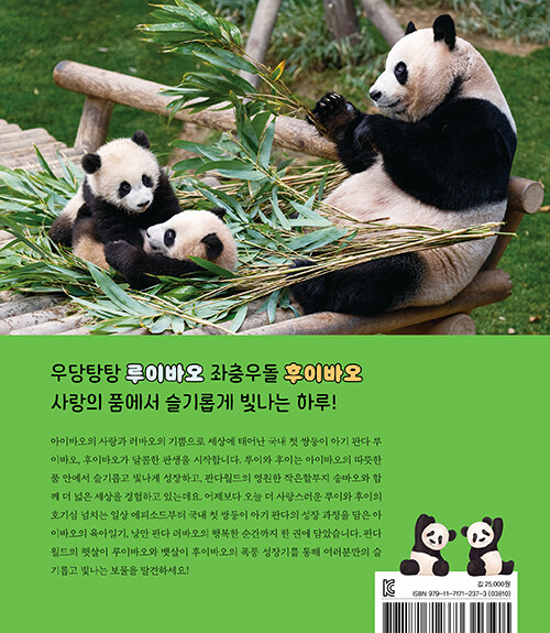 에버랜드 판다월드에 찾아온 또 다른 기적 루이바오와 후이바오의 탄생과 성장의 스토리를 담은 포토에세이가 출간된다. 2023년 7월 7일, 많은 이들의 관심과 애정 아래 아이바오는 국내 첫 쌍둥이 판다 자매를 출산했다. 자연번식으로 태어난 두 아기 판다는 생후 100일 무렵 이름 공모 이벤트를 통해 ‘슬기로운 보물’이란 뜻의 루이바오, ‘빛나는 보물’이란 의미의 후이바오로 이름 지어지며 바오패밀리와 팬에게 특별한 기쁨을 선사했다.