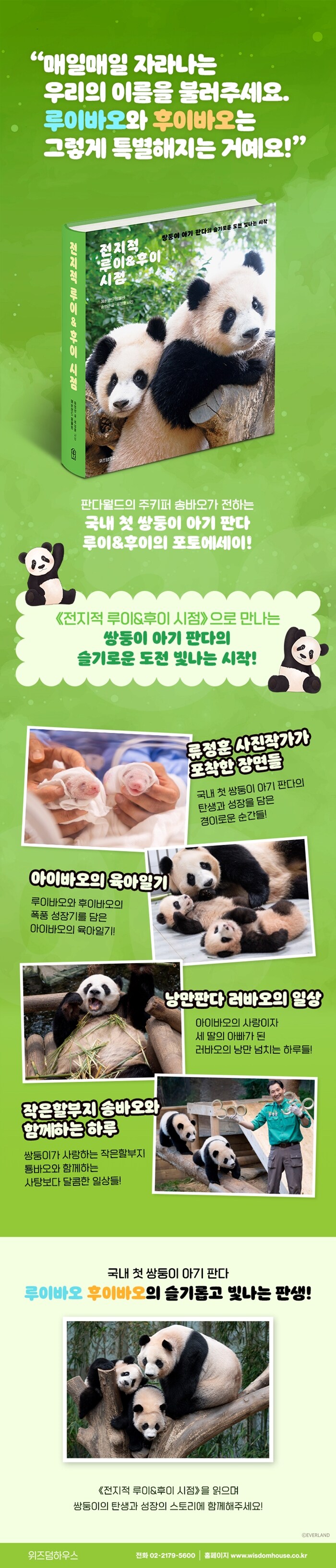 그는 루이바오와 후이바오의 첫 포토에세이를 통해 쌍둥이 아기 판다의 탄생부터 1살이 되기까지 성장과정은 물론, 폭풍 성장담이 담긴 아이바오의 육아일기, 낭만판다 러바오의 행복한 순간을 전한다. 송바오의 밀착 사진은 물론, 국내 첫 쌍둥이 판다의 탄생을 담은 사진으로 2023년 미국 <타임>에 ‘올해의 사진’으로 선정된 류정훈 사진작가(에버랜드 소속)가 포착한 판다월드의 특별하고 행복한 일상도 함께 담겨 있다. 국내 첫 쌍둥이 아기 판다의 행복과 바오패밀리의 사랑이 담긴 이 책을 통해 독자는 각자만의 슬기롭고 빛나는 보물을 발견할 수 있을 것이다.