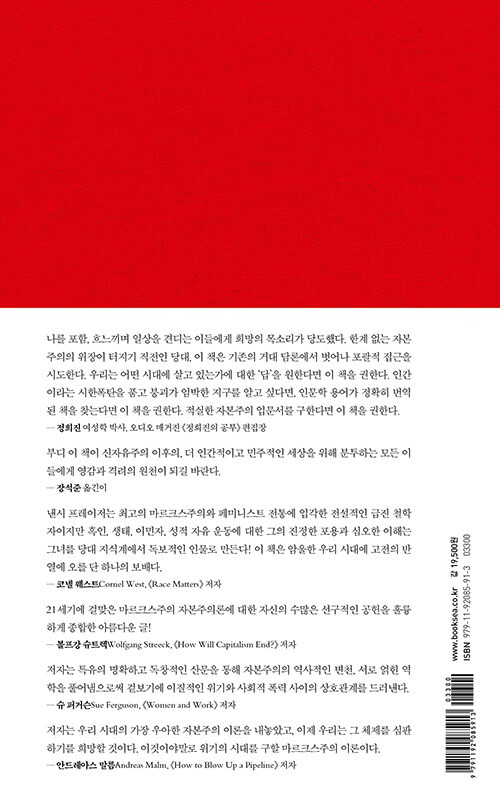 동시대 가장 독창적인 사회철학자, 낸시 프레이저의 역작! 암울한 우리 시대의 ‘가장 우아한 자본주의론’이라 평가받는 이 책은 한 마르크스주의 노학자가 생애 말년에 뜨거운 마음으로 써 내려간, ‘좌파의 길’에 대한 절절한 모색이기도 하다.