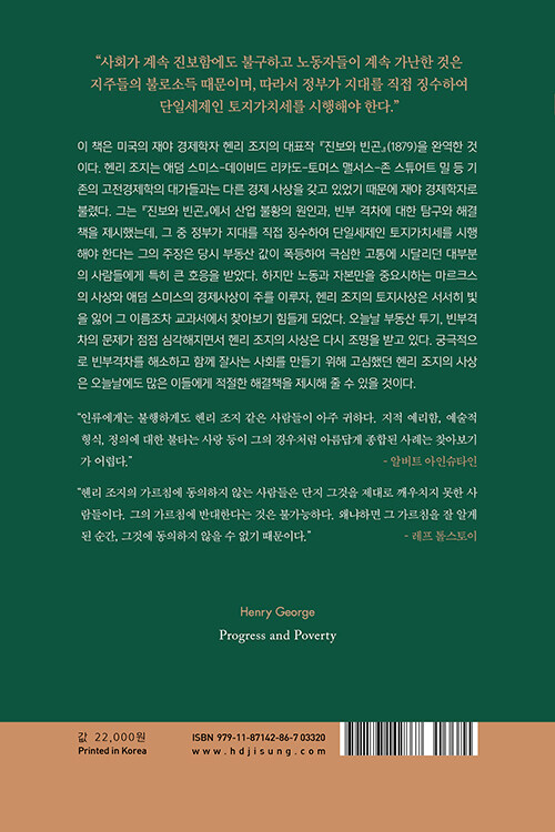 헨리 조지의 대표작 『진보와 빈곤』의 완역본이다. 헨리 조지는 애덤 스미스-데이비드 리카도-토머스 맬서스-존 스튜어트 밀 등 기존의 고전경제학의 대가들과는 다른 경제 사상을 갖고 있었기 때문에 재야 경제학자로 불렸다. 그는 『진보와 빈곤』에서 산업 불황의 원인과, 빈부 격차에 대한 탐구와 해결책을 제시했는데, 그 중 정부가 지대를 직접 징수하여 단일세제인 토지가치세를 시행해야 한다는 그의 주장은 당시 부동산 값이 폭등하여 극심한 고통에 시달리던 대부분의 사람들에게 특히 큰 호응을 받았다.