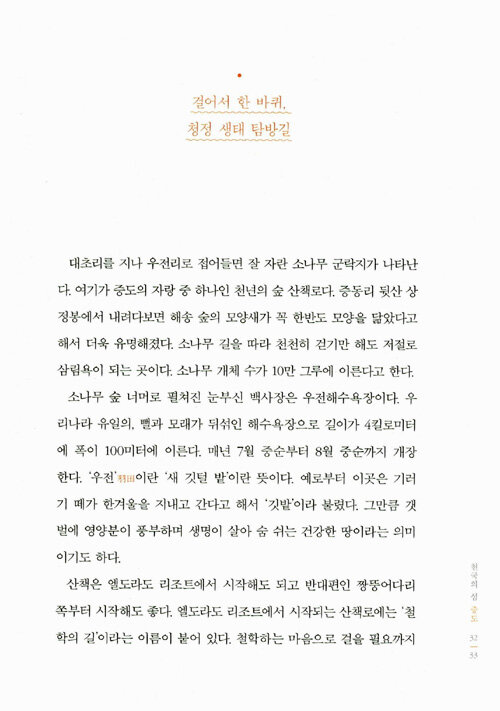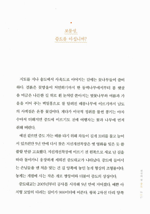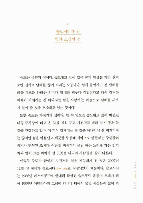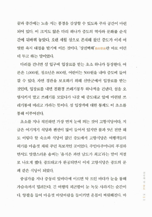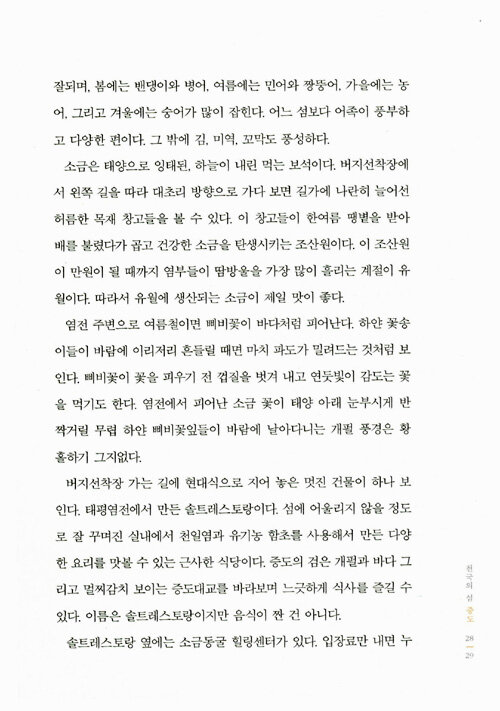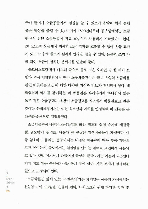 초판 출간 이후 증도에 다리가 놓이고 슬로시티로 지정되는 등 많은 변화가 있어 다시 한 번 심층 취재하여 새로운 증도의 모습을 소개한다. 마을 한 곳 한 곳을 직접 찾아 담아낸 50여 컷의 사진으로 증도의 어제와 오늘을 생생하게 느낄 수 있다.