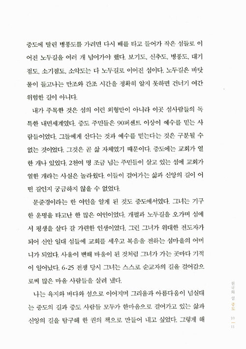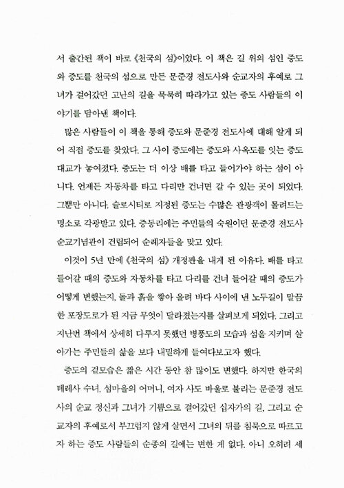 주민 90퍼센트 이상이 예수를 믿는 섬 증도 이야기. 저자는 2007년 문준경 전도사의 순교 정신을 본받아 날마다 예수와 함께 사는 증도 신앙 공동체 이야기를 담은 <천국의 섬>이라는 책을 펴냈다. 이 책을 통해 많은 사람들이 문 전도사와 증도를 알게 되어 직접 증도를 찾았으며, 이 책을 토대로 2009년 12월 CBS에서 창사 특집 드라마 [시루섬]이 제작·방영되는 등 뜨거운 관심을 받았다.