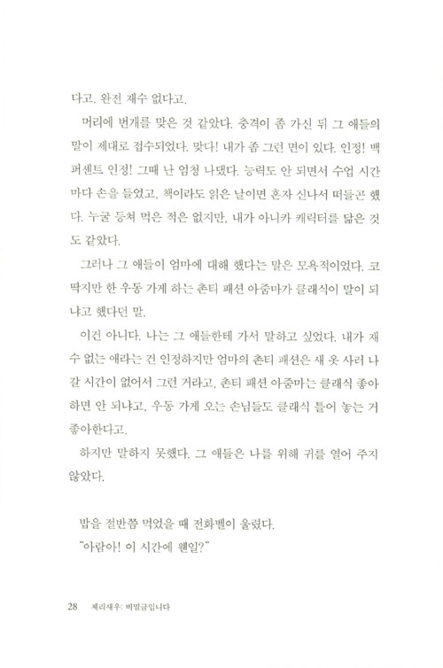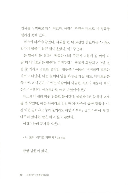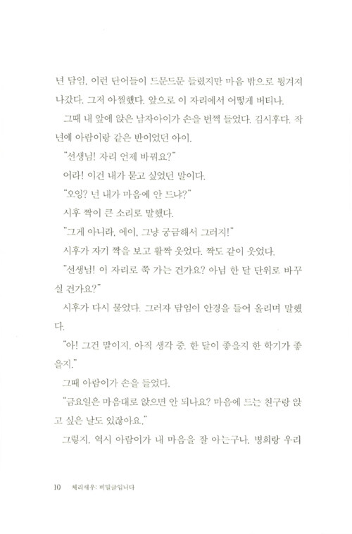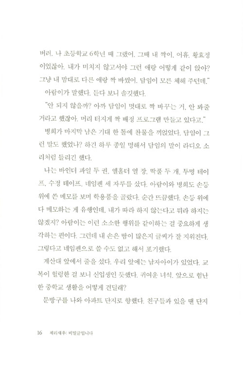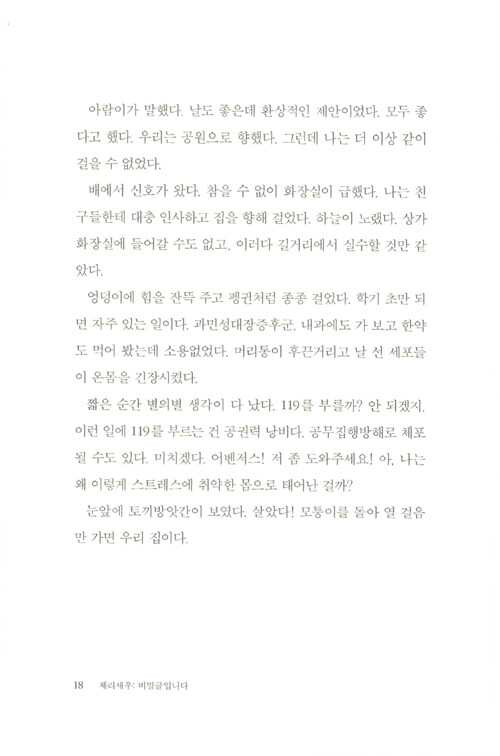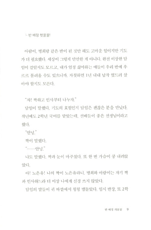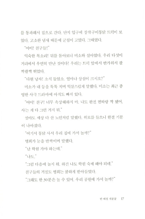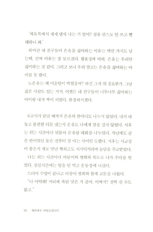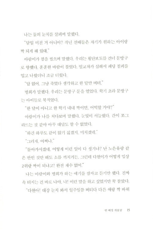 제9회 문학동네청소년문학상 대상 수상작. 관계의 굴레와 스트레스에서 벗어나 스스로를 있는 그대로 사랑하기까지 다현이의 여정이 담겼다. 교실에서 펼쳐지는 복잡하고 미묘한 관계의 풍경, 그러한 관계를 겪어 내는 중2 화자의 목소리가 너무도 생생하여 심사위원들을 놀라게 한 작품이다.