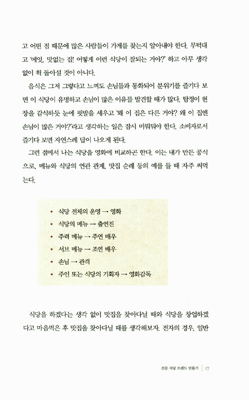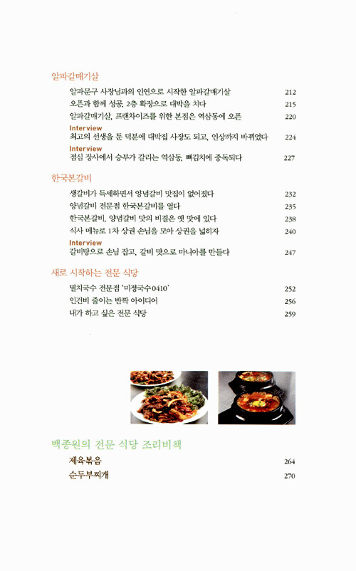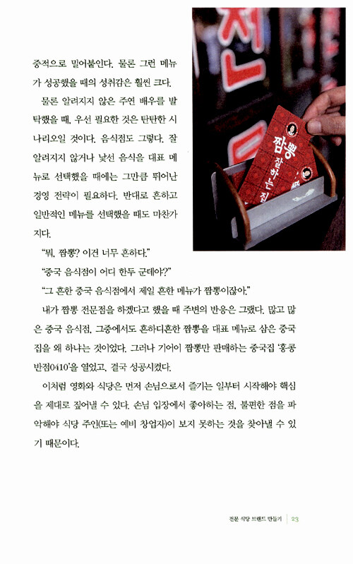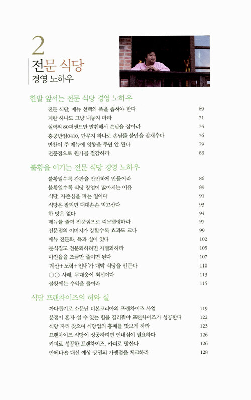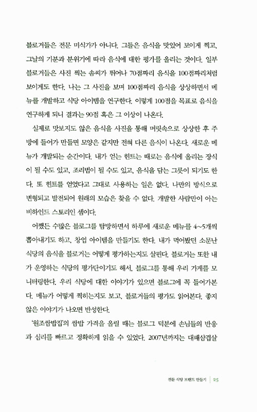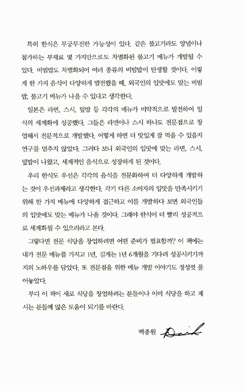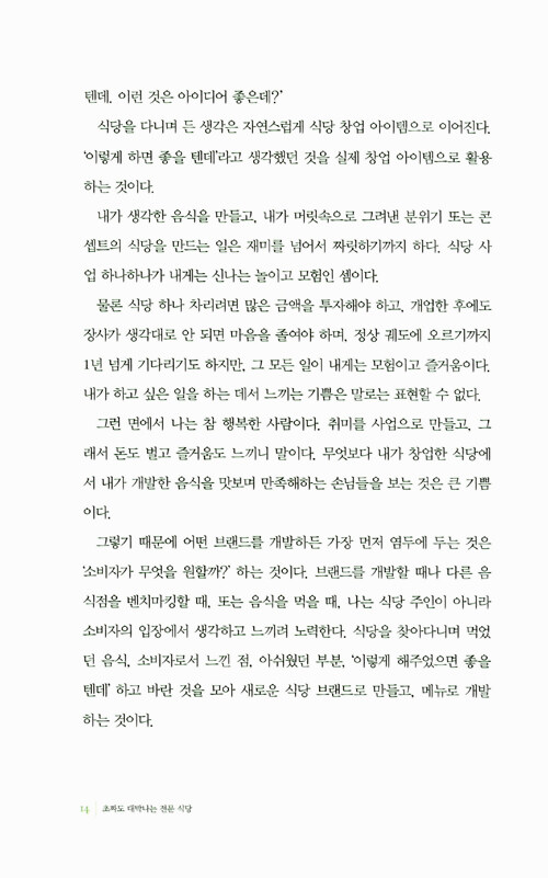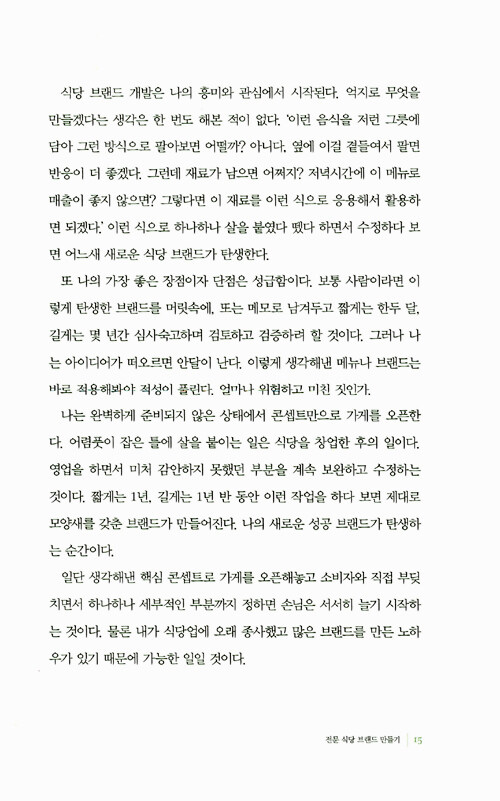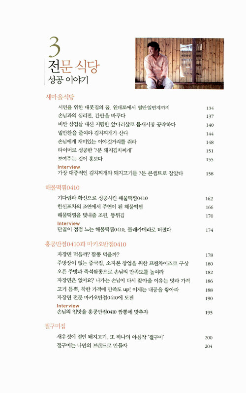 이 책에서는 저자의 대표 브랜드인 ‘새마을식당’, ‘해물떡찜0410’, ‘홍콩반점0410’, ‘마카오반점0410’, ‘절구미집’, ‘알파갈매기살’, ‘한국본갈비’ 등의 콘셉트를 세우고 브랜드를 오픈한 후 자리 잡기까지의 과정을 소개한다. 또한 새로 시작하는 ‘미정국수0410’을 비롯하여 앞으로 열고 싶은 전문 식당에 대한 포부도 밝힌다.