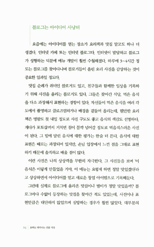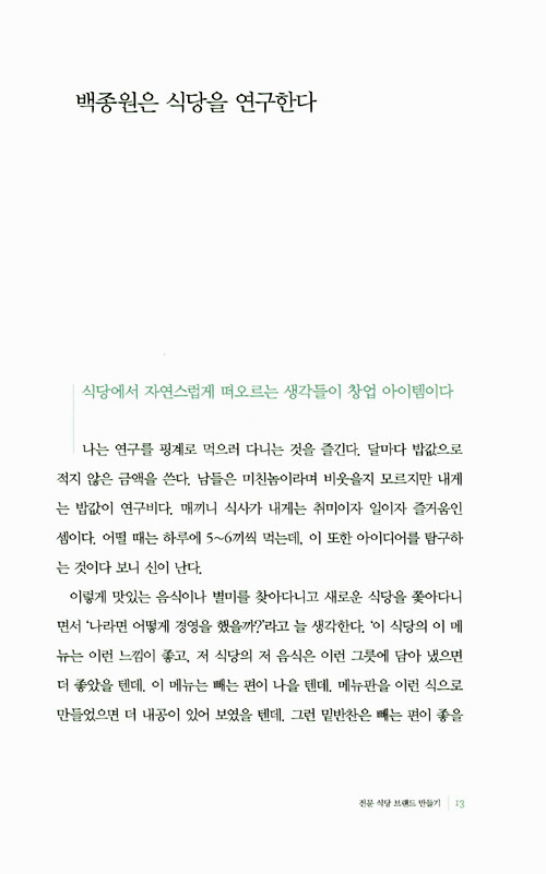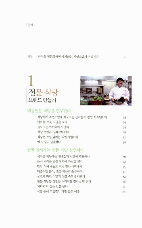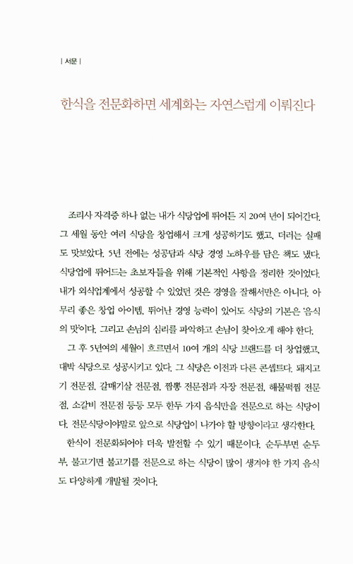 전문 식당을 통해 프랜차이즈업계에 뛰어들게 된 외식경영 전문가 백종원이 전문 식당이 대박을 내는 이유와 그 노하우를 실례를 들어 설명한다. 저자는 성공하는 전문 식당을 위한 조건으로 ‘인내심’을 꼽는다. 콘셉트를 지키고, 메뉴를 늘리지 않으며, 음식의 질과 맛을 유지시키며 기다릴 것. 이것이 저자가 강조하는 전문 식당 성공 노하우다.