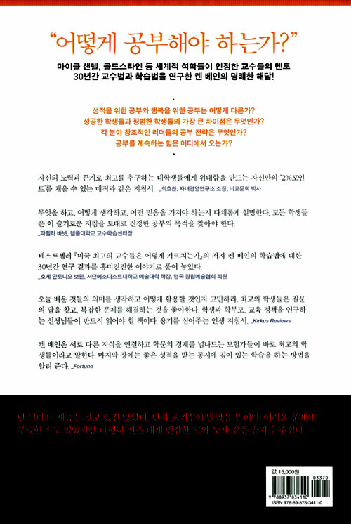 켄 베인 박사는 자신이 계속 발전할 수 있다고 믿는 호기심 가득한 학생이 성적을 위해 공부하는 높은 지능의 전략적 학습자들을 결국 능가하게 된다는 점을 밝혀냈다. 자신을 통제하는 능력인 ‘메타 인지’, 그리고 능력을 적절히 활용해 실천할 수 있다는 ‘자기 효능감’을 발견한 학생들이 사회적으로 성공한다. 이 책은 입학과 취업 등 눈앞의 목표에만 급급한 젊은이들에게 궁극적인 꿈을 이루기 위한 공부법이 무엇인가에 대한 신선한 해법을 제시한다.