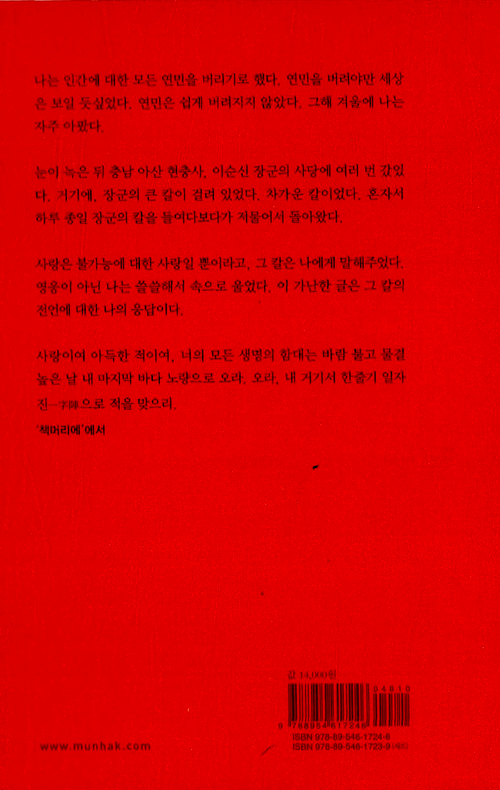 2001년 동인문학상 수상작. 이견의 여지가 없는 신화, 이순신. 이순신은 헤아릴 수 없이 많은 적선들 앞에 초라한 숫자의 배를 몰고 나가 세계 해전사에 유례를 찾을 수 없는 대승을 거둔 명장이다. 한 국가의 운명을 단신의 몸으로 보전한 당대의 영웅이며, 정치 모략에 희생되고, 장렬히 전사한 인물로 알려져 있다.