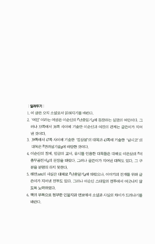 이순신에 관한 많은 이야기들이 전해진다. 그러나 그 속에는 이순신이라는 실존은 사라지고 없다. 이 소설은 당대의 사건들 속에 이순신이라는 개인을 다루며 이순신을 인간적인 존재로 표현한다.