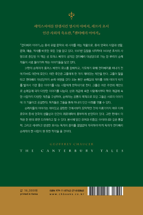 중세 유럽 문학의 새 시대를 여는 작품으로, 중세 영국의 사람과 생활, 문화, 예술, 역사를 비롯한 모든 것을 담고 있다. 1387년 집필을 시작하여 1400년 초서의 사망으로 중단된 이 책은 성 토머스 베켓의 성지인 캔터베리 대성당으로 가는 한 무리의 순례자들이 서로 돌아가며 하는 이야기들을 담고 있다.