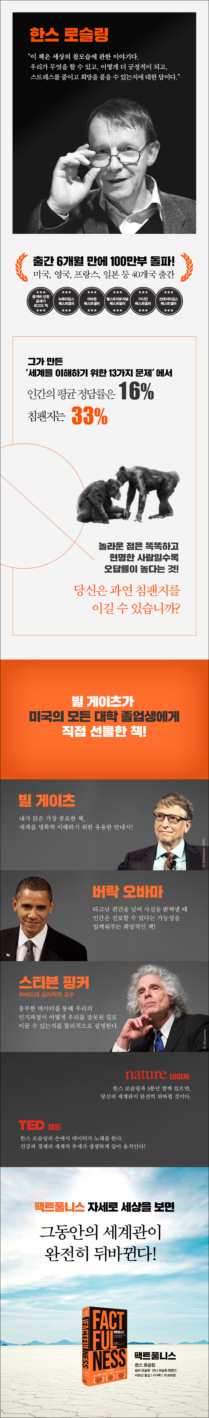 전 세계적으로 확증편향이 기승을 부리는 탈진실의 시대에, 막연한 두려움과 편견을 이기는 팩트의 중요성을 일깨우는 세계적 역작이다. 세계를 이해하기 위한 13가지 문제에서 인간의 평균 정답률은 16%, 침팬지는 33%. 우리는 왜 침팬지를 이기지 못하는가?