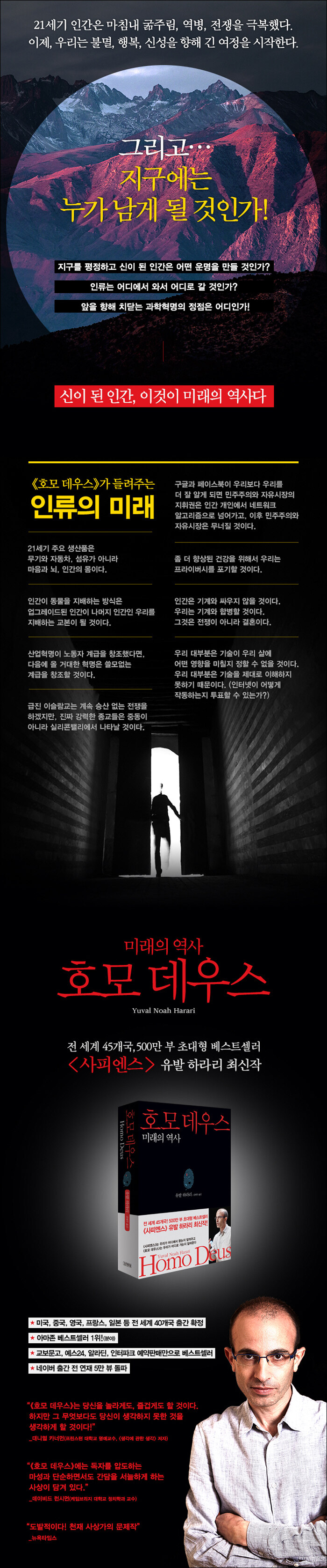 인류는 어디로 갈 것인가. <사피엔스> 저자 유발 하라리의 후속작. 역사의 시간 동안 인류의 가장 큰 과제이던 굶주림, 질병 그리고 전쟁을 밀어내고 그 자리를 차지한 것은 무엇인가? 지구를 평정하고 신이 된 인간은 어떤 운명을 만들 것인가? 인류는 어디에서 와서 어디로 갈 것인가? 10만 년간 지속되어온 호모 사피엔스의 믿음을 한순간에 뒤엎은 역사 탐구서이다.