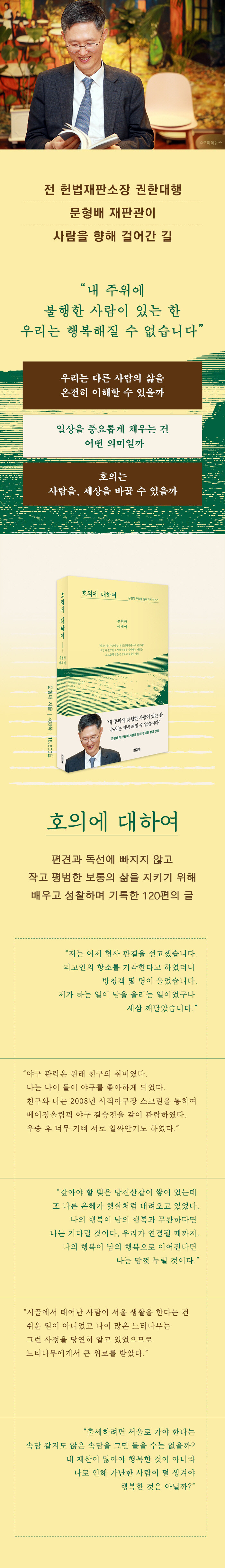 호의는 사람을, 세상을 어떻게 바꾸는가. 받은 것을 사회에 되돌려주라던 김장하 선생과의 추억, 법을 몰라 손해 보는 이들을 헤아리는 마음, ‘자살’을 시도했던 재소자가 ‘살자’는 다짐을 하게 만든 선물, 사랑하는 이를 그리워하며 속절없이 흘리는 눈물, 그리고 건강한 법원과 사회를 향한 진심 어린 조언. 더 나은 길에 대한 소박한 상상과 아름다운 이들에 대한 따뜻한 진심. 문형배가 말하는 결코 탄핵할 수 없는 것에 대하여.
