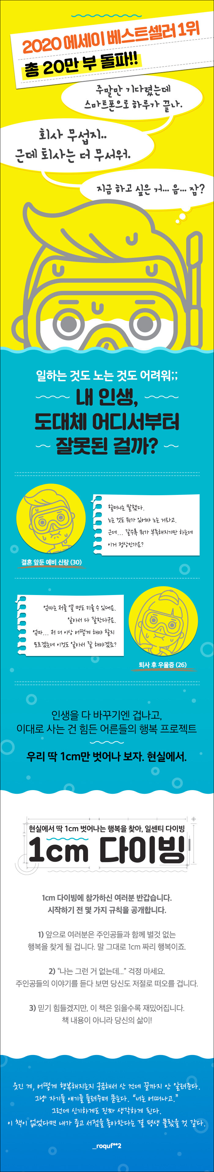 우리가 찾고 싶은 건 이런 것이다. 현실에서 딱 1cm 벗어나는 행복. 최소한의 노력과 최소한의 위험으로 웃으며 살 수 있는 그런 방법. 프로젝트 1cm 다이빙 함께 하시겠습니까?
