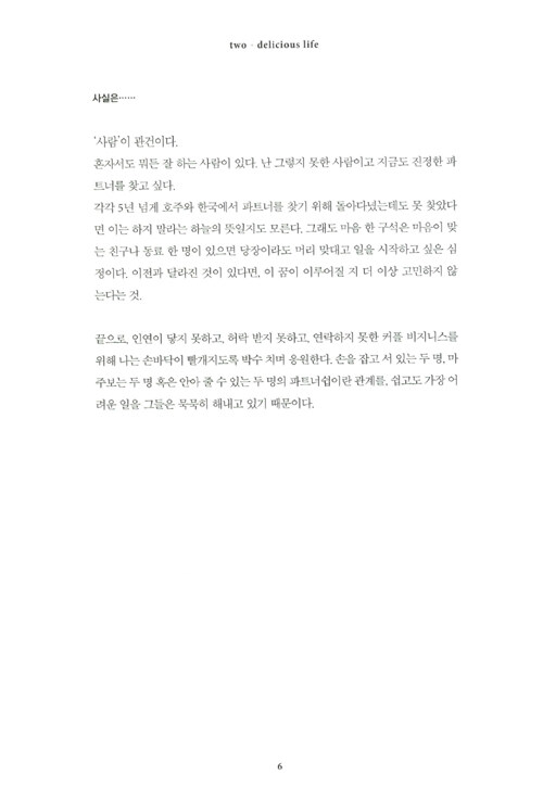 캐나다와 호주에서 페이스트리를 전공하고 <커피 매거진>에 오랫동안 글을 기고해온 전문 기자인 저자가 부부, 친구, 형제, 자매, 커플이 운영하는 2인 가게 20곳을 소개한다. 각 가게에 숨어 있는 따뜻한 스토리와 함께 커피와 디저트에 관한 깊이 있는 정보를 알기 쉽게 풀어 들려준다.