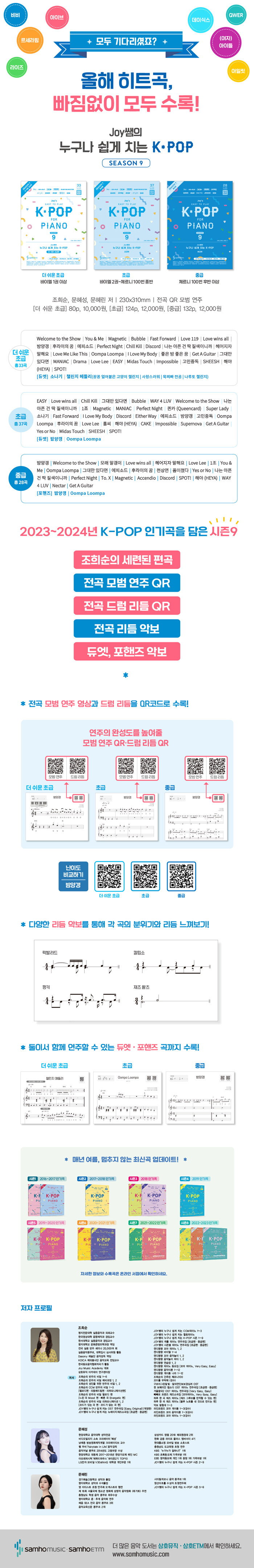 ‘밤양갱’으로 선풍적인 인기를 누리고 있는 비비(BIBI)부터 차트 상위권을 달리고 있는 아이브(IVE), 르세라핌(LE SSERAFIM), 아일릿(ILLIT)까지 K-POP 선두 그룹들의 최신곡을 모은 연주곡집이다. 2017년도부터 꾸준히 업데이트 중인 ‘Joy쌤의 누구나 쉽게 치는 K-POP’ 시리즈 시즌9에는 2023년 하반기부터 2024년 상반기까지의 인기곡을 담았다.