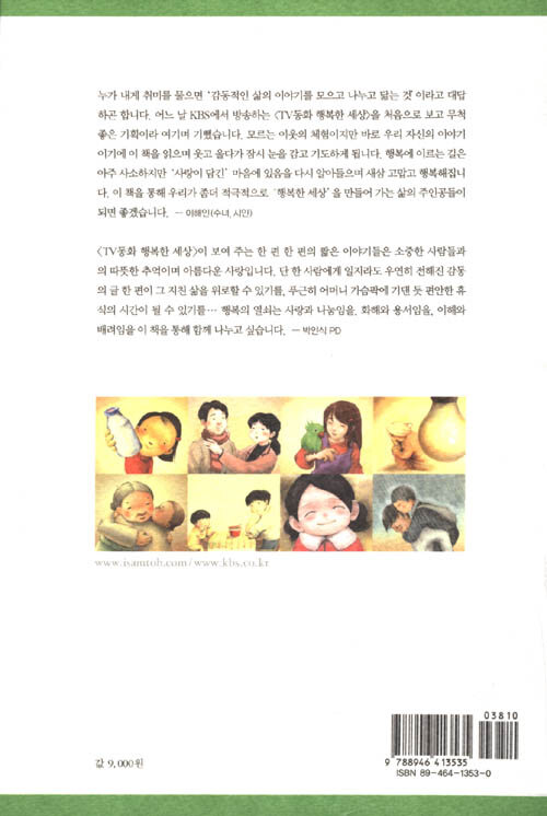 TV 동화 행복한 세상’은 아름답고 감동적인 사연들을 파스텔톤의 애니메이션과 이금희씨의 정감있는 목소리로 수많은 사람들의 눈시울을 적셨다. 이 감동을 고스란히 종이책에 옮겨 놓은 <TV동화 행복한 세상>은 마치 방송을 다시 보는 듯한 느낌이다.